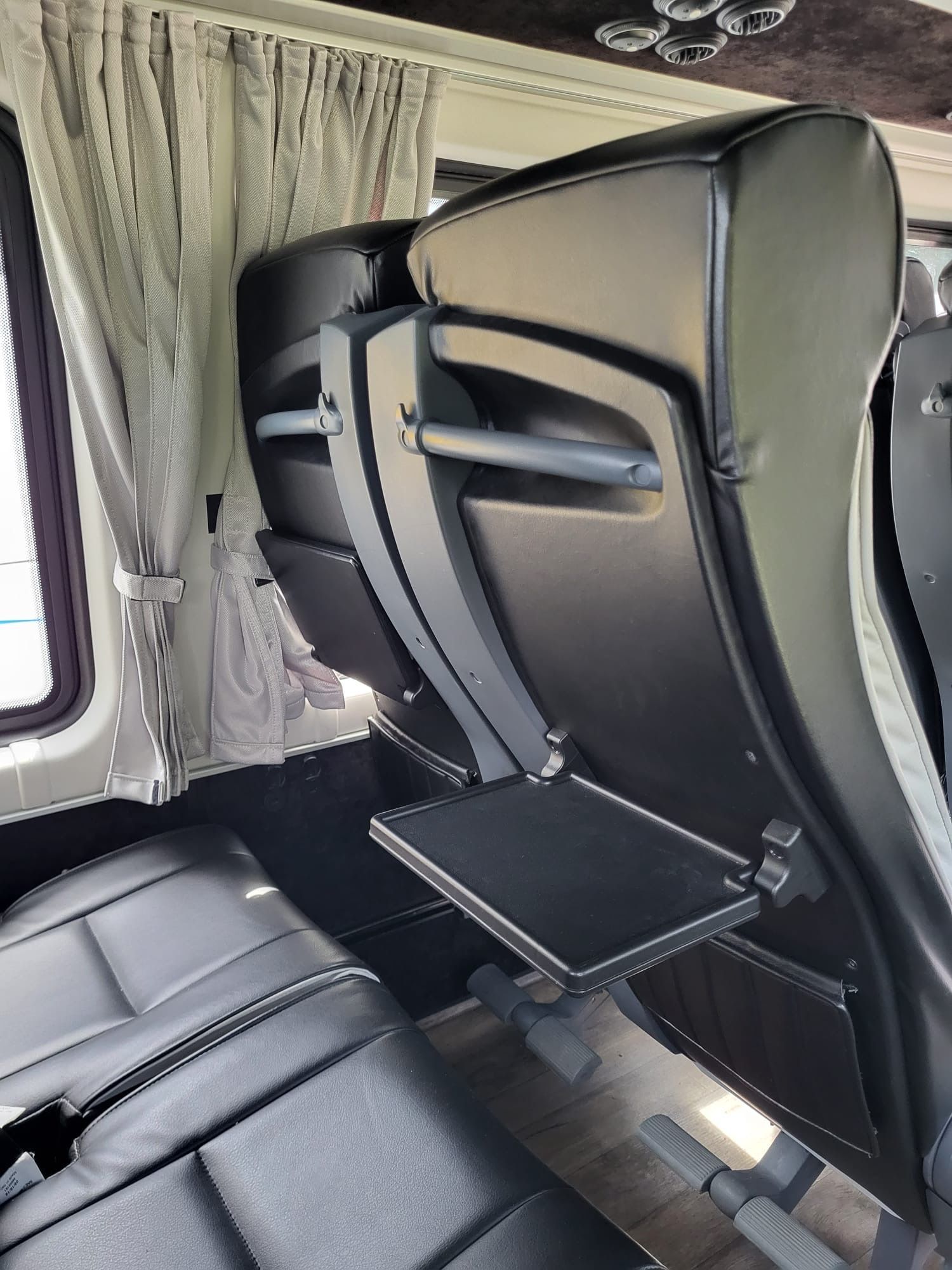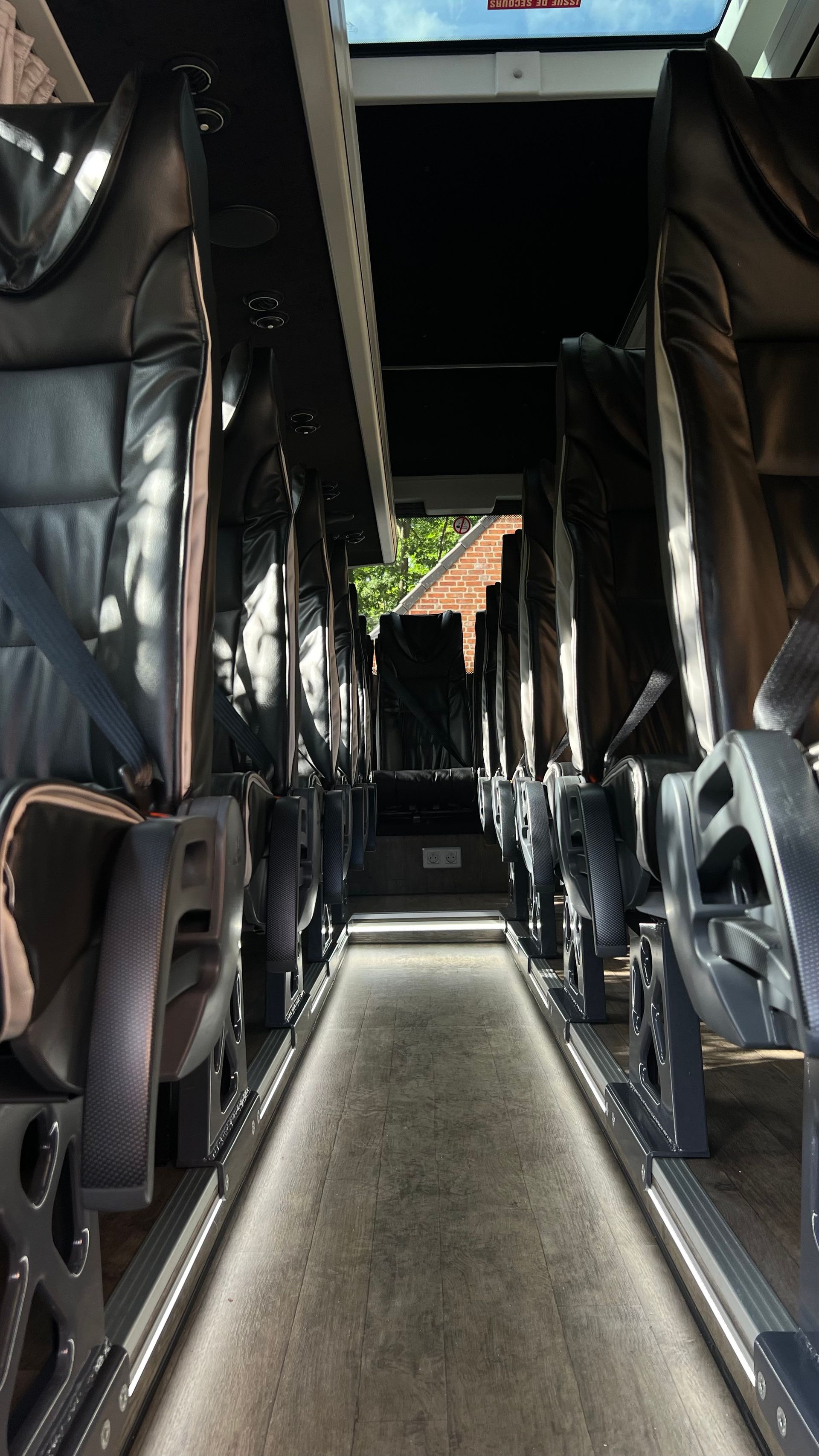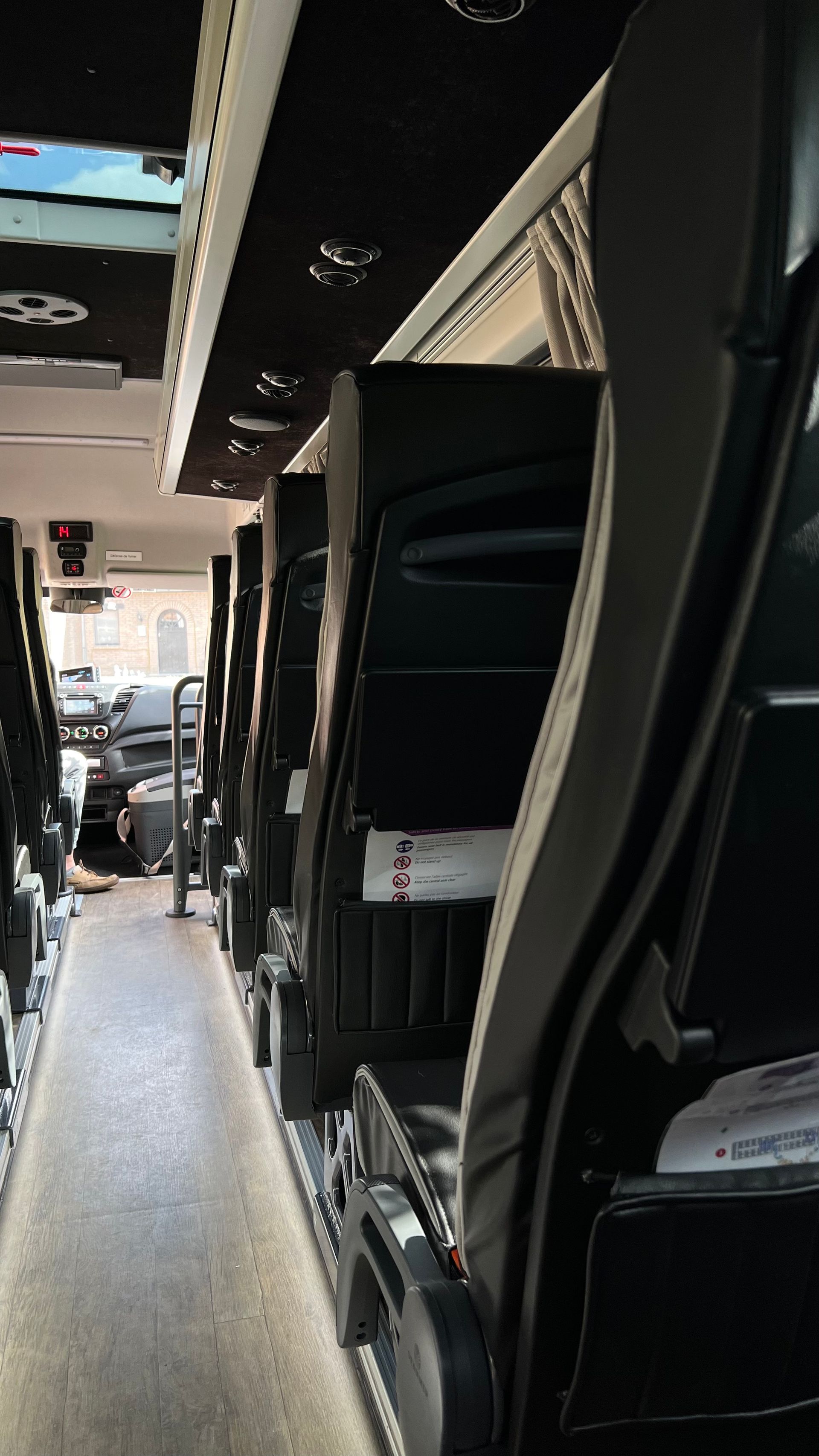 Een uitzonderlijk voertuig verdient een uitzonderlijke carrosserie. Voor de vervaardiging van ons voertuig vertrouwden wij op de zeer gerenommeerde carrosseriebouwer MUSSA & GRAZIANO. Hij is uitgerust met stoelen van natuurlijk leer, met verstelbare rugleuningen en zijdelingse offset. Verstelbare hoofdsteun. Individuele tablets en e-readers. Pneumatische vering voor meer comfort. USB-oplader. Ook uitgerust met een koelkast.